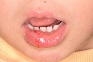 30分前にこけて上の前歯を強打し、この写真からはわかりませんが、上の前歯の位置異常(脱臼)が生じています。