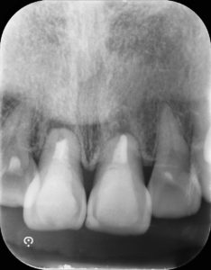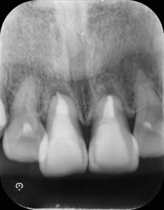 所見:失活した右上中切歯に帯状の変色があり。既根管治療歯であり、根尖病変も存在する。歯根長は短く、残存歯質もかなり菲薄化している。